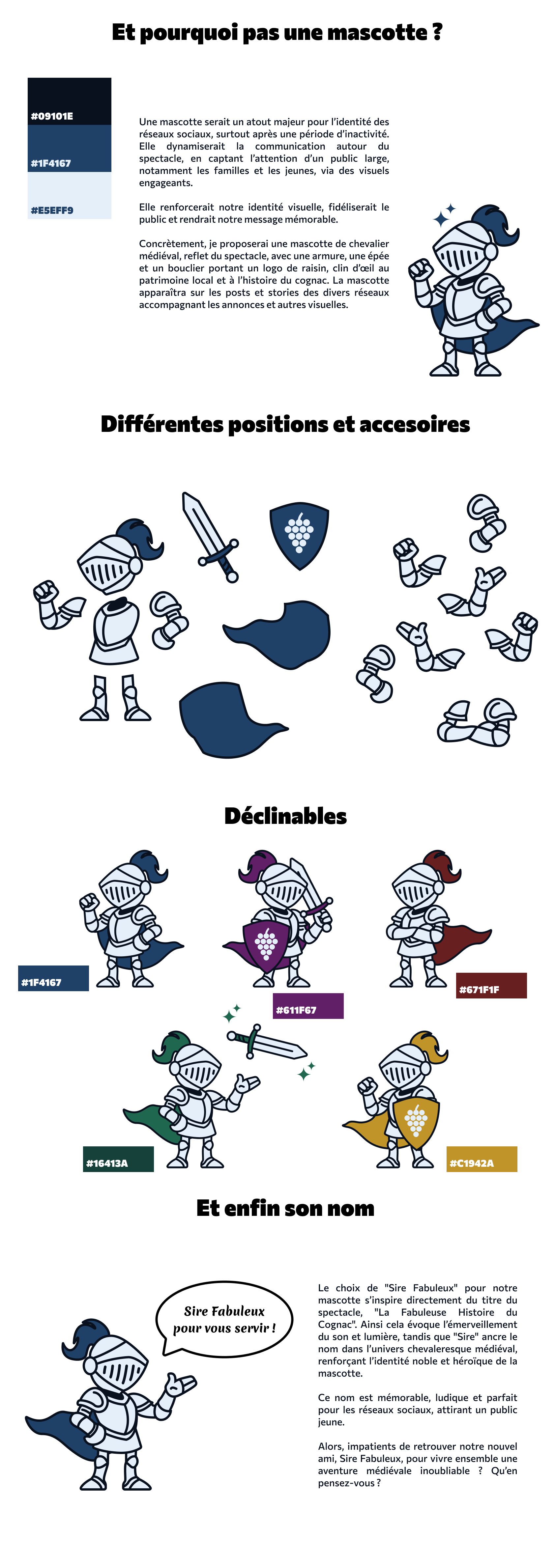 J’ai redynamisé l’identité visuelle en créant une palette de couleurs vibrantes et en concevant les mascottes "Sir Fabuleux" et "Comtesse Fabuleuse" pour refléter l’esprit médiéval avec une touche moderne. J’ai analysé les codes existants et les concurrents pour proposer des polices lisibles comme "Mérienda" et "Commissioner", adaptées à tous les supports. Ce travail a donné une nouvelle vie à l’image de l’association, renforçant son attractivité auprès d’un public varié.
